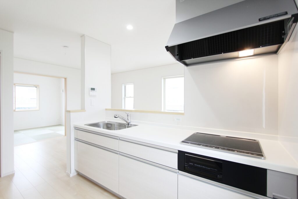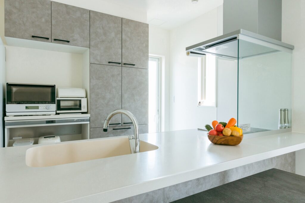 最新のガスコンロとスリム型レンジフードを組み合わせることで、キッチンが明るく、モダンな印象に生まれ変わります。中古マンションでも、キッチンの印象が大きく変わるポイントです。